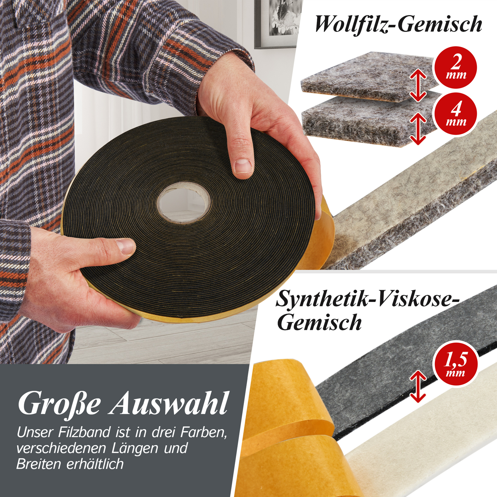 Das Filzband ist für eine Vielzahl von Anwendungen geeignet. Verwenden Sie es beispielsweise zur Dichtung, als Isolierung oder Klapperschutz. Sie können das Filzband einfach mit einer Schere auf die gewünschte Form und Größe schneiden.