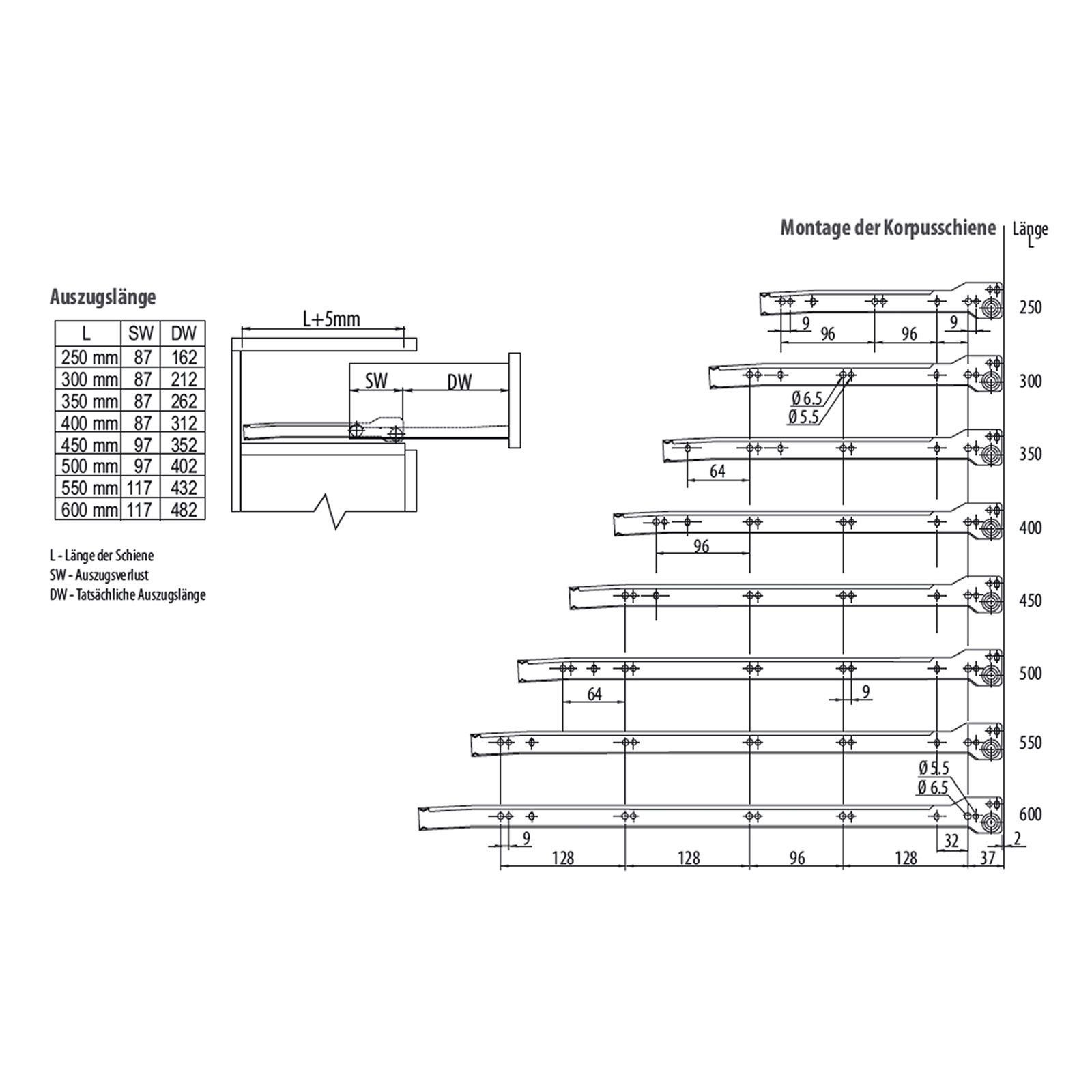 KÖNIG Teilauszug Rollschubführung weiß TA-20-NF 250-600 mm.
