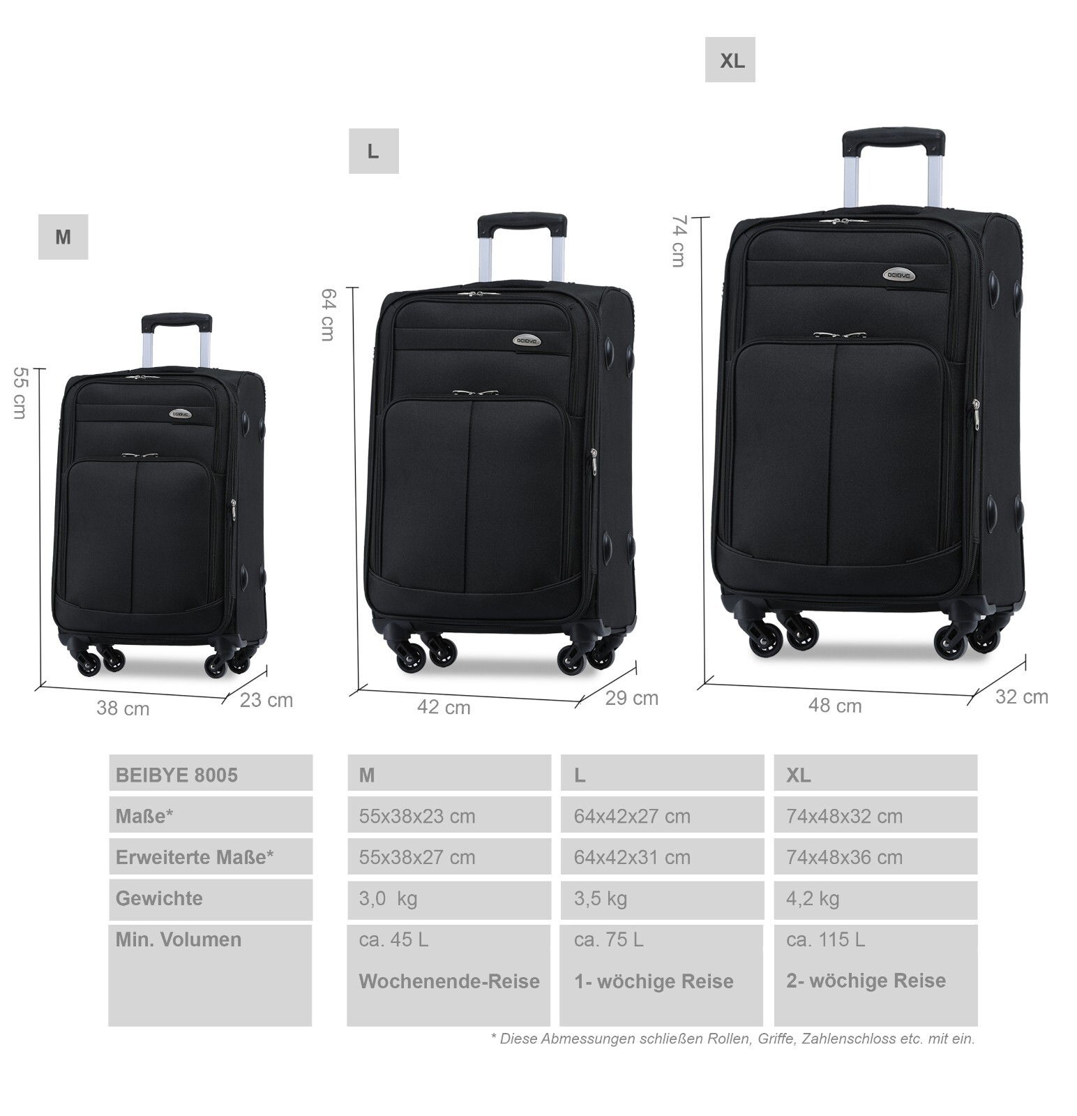 Mass- und Gewichtsangaben: (inkl. Rollen und Griffe): Grösse XL Außenmassen: ca. 74 x 48 x 32 cm Gewicht: ca.4,2 kg ; Grösse L Außenmassen: ca. 64 x 42 x 27 cm Gewicht:ca. 3,5 kg; Grösse M Außenmassen: 55 x 38 x 23 cm Gewicht: ca.3,0 kg.